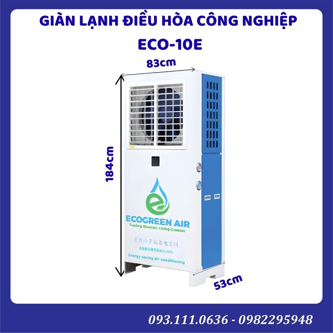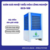 Dàn giải nhiệt của điều hòa công nghiệp ECO – 10E hình chữ nhật đứng, với thiết kế cánh quạt phía trên hướng lên. Điều hòa công nghiệp ECO – 10E làm lạnh bằng khí gas giải nhiệt bằng nước.