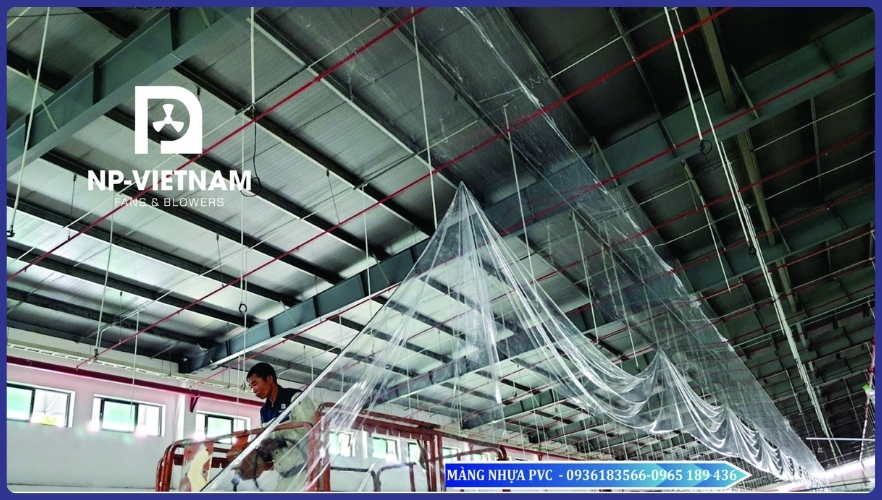 Ngoài ra lắp màng chắn gió PVC có tác dụng làm không khí lạnh chỉ đi ở tầm thấp bên dưới nhà xưởng.