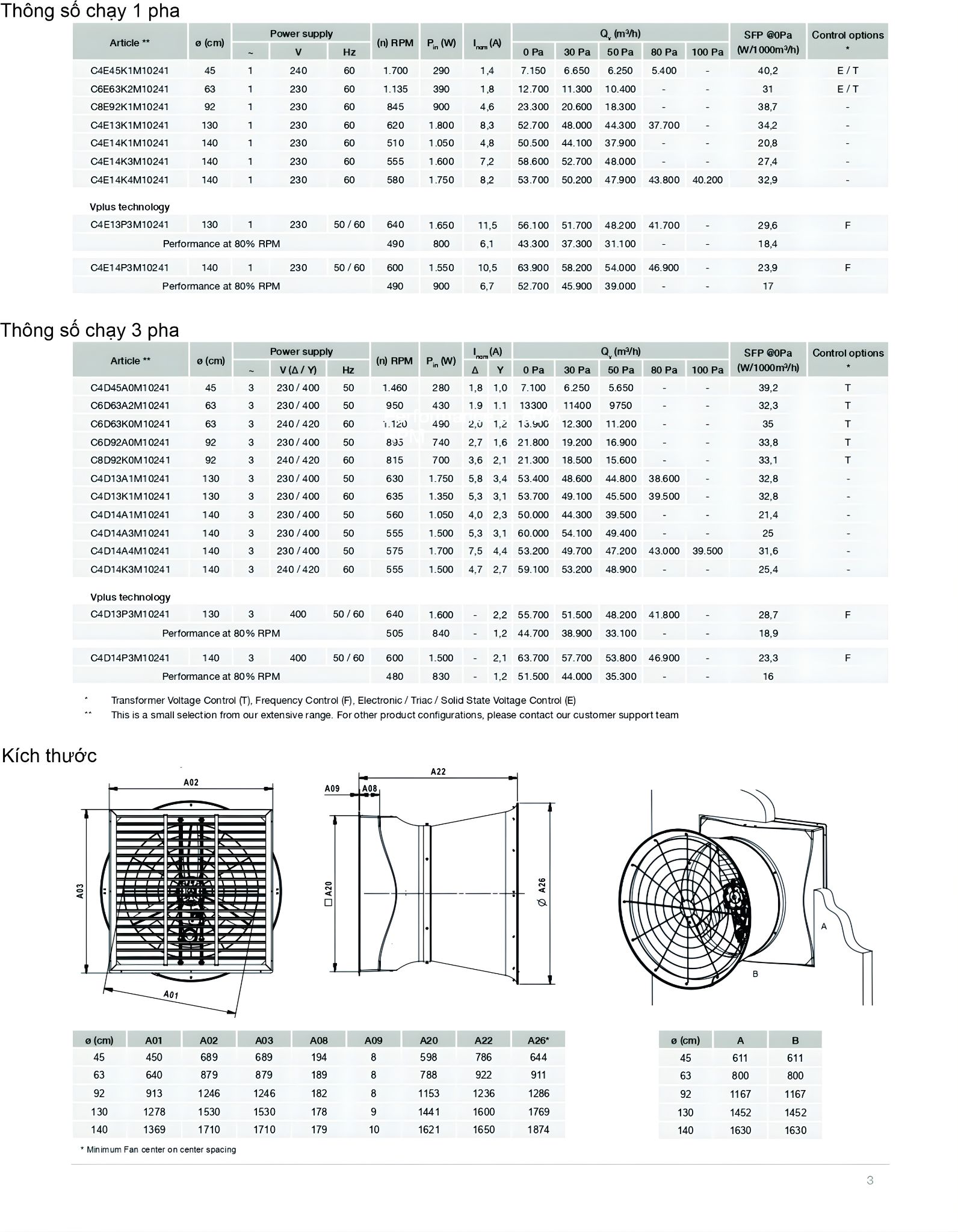 1: Thông số và kích thước quạt hút công nghiệp ComPosite Multifan (Technical data and Dimensions)