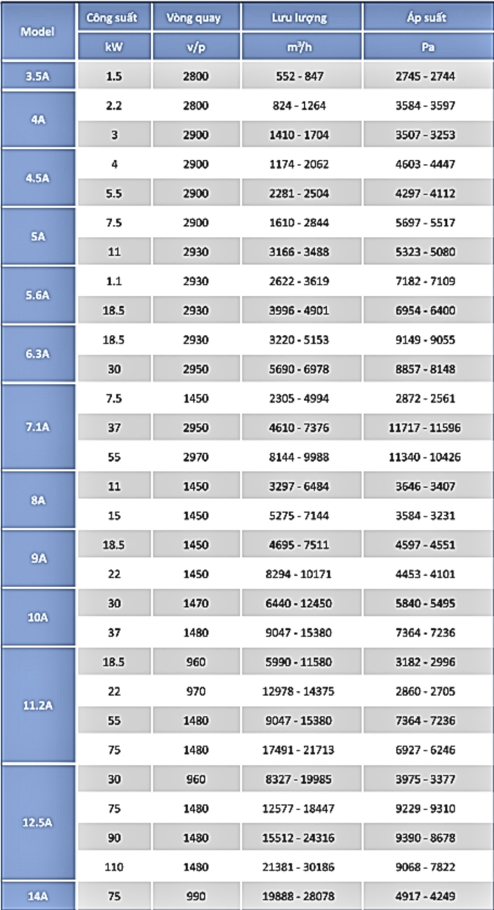 3. Các công suất phổ biến ở quạt ly tâm công suất lớn