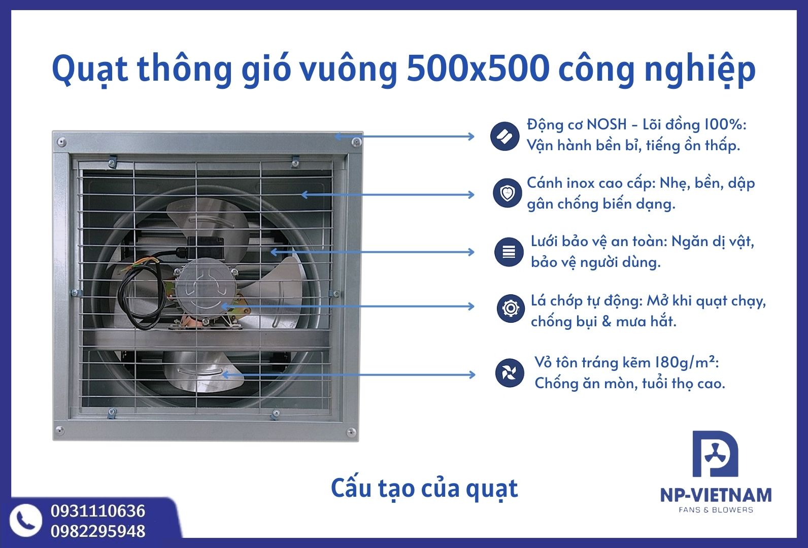 Hình ảnh: Cấu tạo của quạt thông gió vuông 500x500 công nghiệp