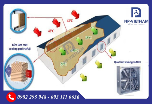 Hình ảnh: Mô hình hệ thống làm mát bằng tấm làm mát chống rêu Hafui kết hợp quạt hút công nghiệp vuông Nako