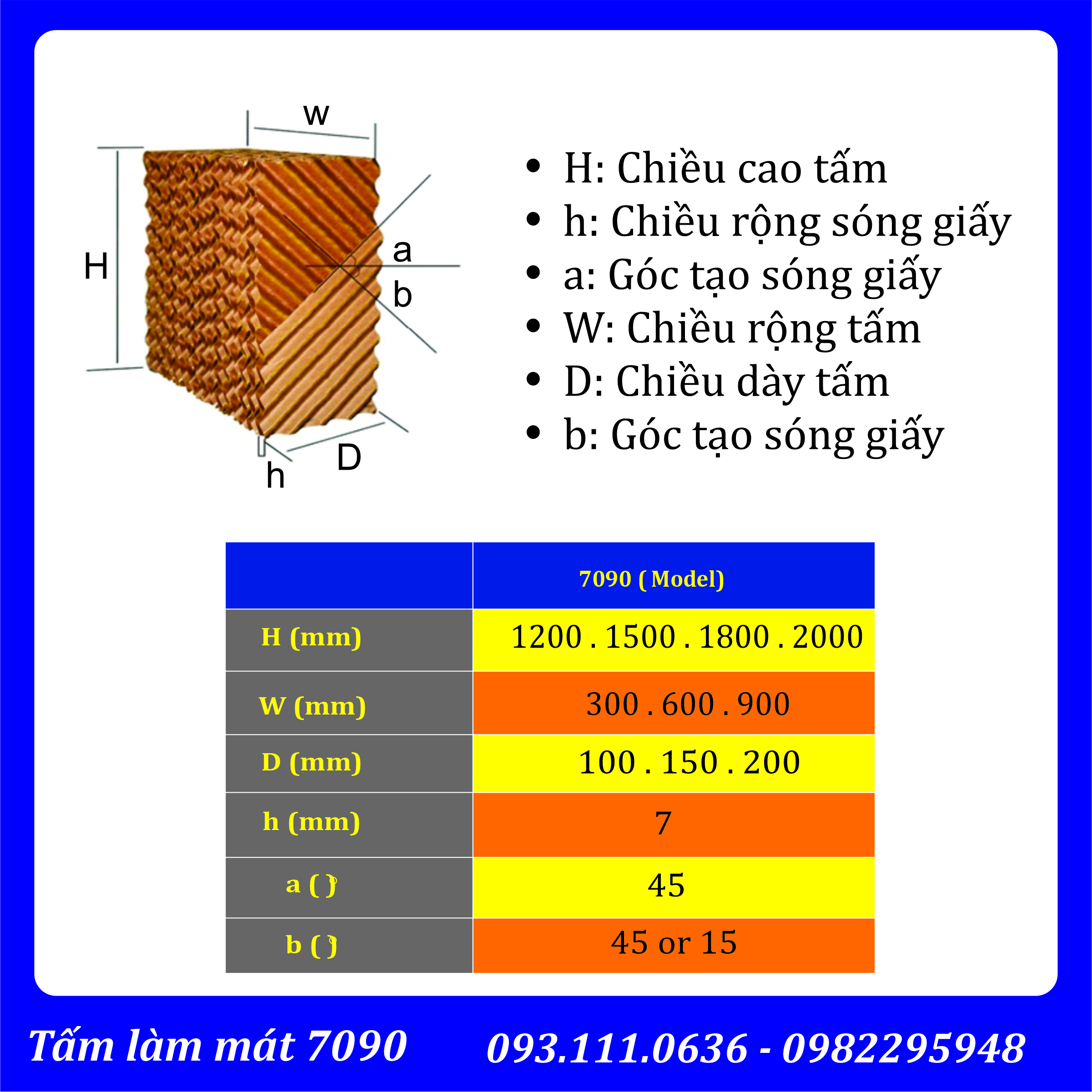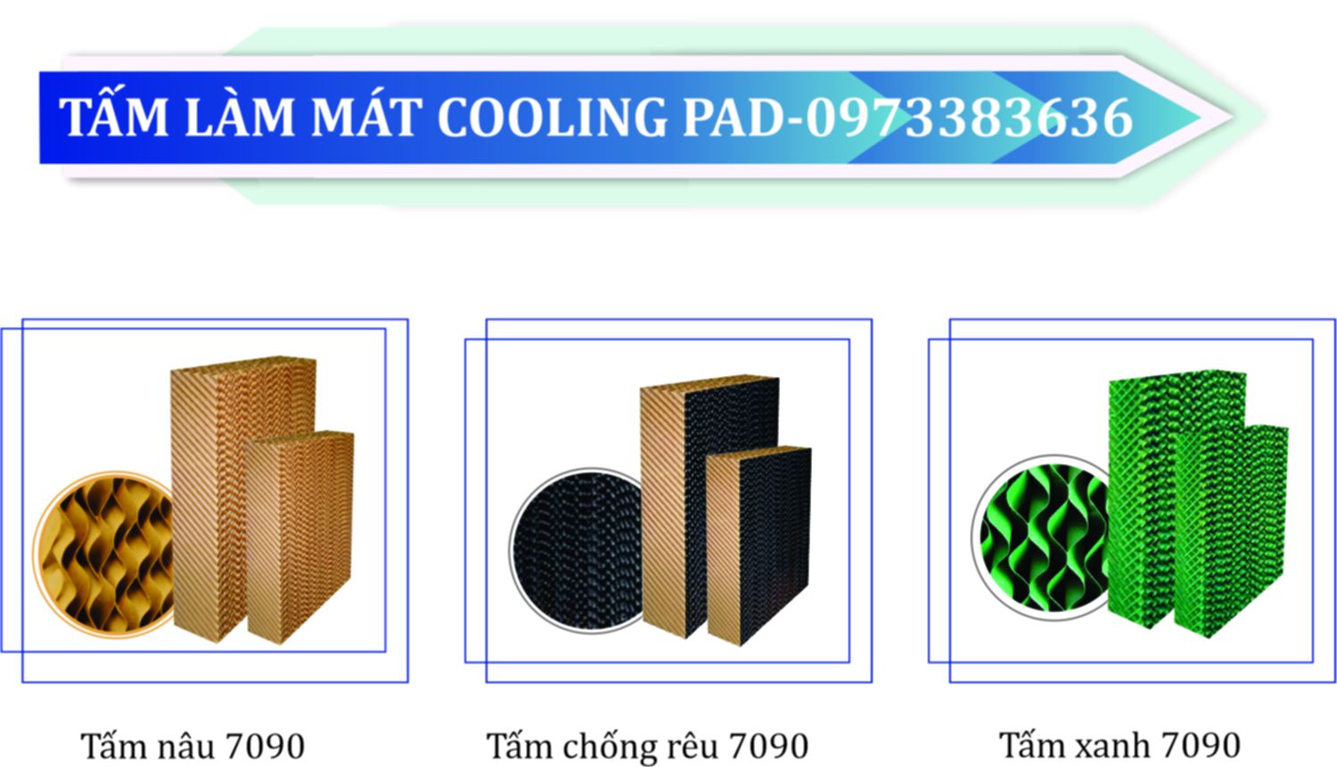 Tấm làm mát 7090 là tấm cooling pad sản xuất bằng loại giấy chống nước. Với mắt lỗ lớn 7mm, góc nghiêng của sóng là 45/45 hoặc 45/15. Không khí qua tấm lưu thông tốt hơn với lưu lượng lớn hơn.
